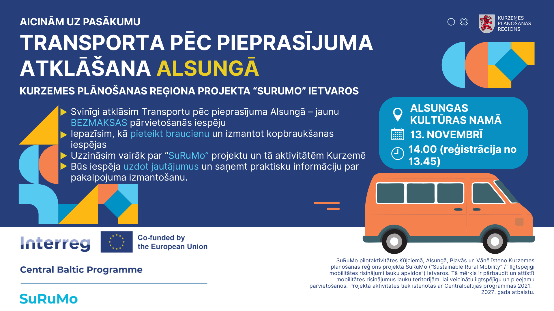 Ceturtdien 13. novembrī, Alsungā tiks svinīgi atklāts jauns pārvietošanās veids Kurzemē – transports pēc pieprasījuma, kas iedzīvotājiem sniegs iespēju ērti, elastīgi un bez maksas pārvietoties starp tuvākajām apdzīvotajām vietām pēc individuāla pieprasījuma. Pakalpojums tiks piedāvāts pilotteritorijās – Alsungā un Vānē, kļūstot par pirmo šāda veida risinājumu Kurzemes reģionā.
