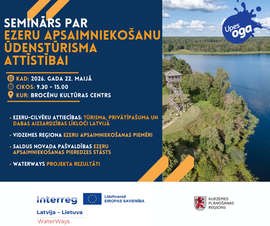 Aicinām uz semināru “Ezeru apsaimniekošana ūdenstūrisma attīstībai Kurzemē”! Šī gada 22. maijā Brocēnos norisināsies seminārs, kas veltīts aktuālam un arvien nozīmīgākam jautājumam – kā ilgtspējīgi apsaimniekot ezerus, vienlaikus attīstot ūdenstūrismu un saglabājot dabas vērtības. Pieaugot interesei par aktīvo atpūtu dabā un ūdenstūrismu, ezeri kļūst par būtisku resursu gan vietējām kopienām, gan uzņēmējdarbības attīstībai. Vienlaikus tas […]