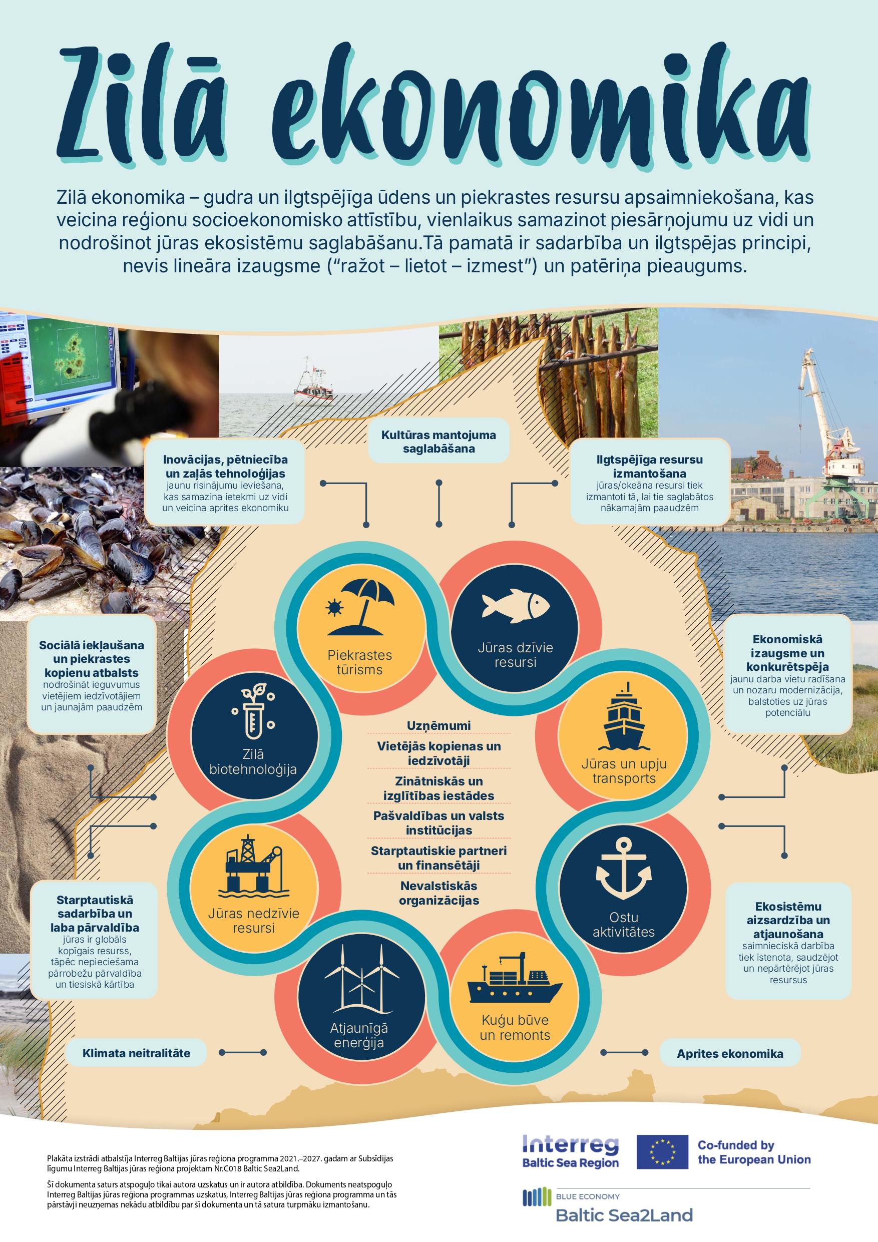 Viens no plakātiem atspoguļo zilās ekonomikas tēmu, skaidrojot zilās ekonomikas jēdzienu, informējot par zilās ekonomikas jomām, sektoriem un dažādām iesaistītajām pusēm.