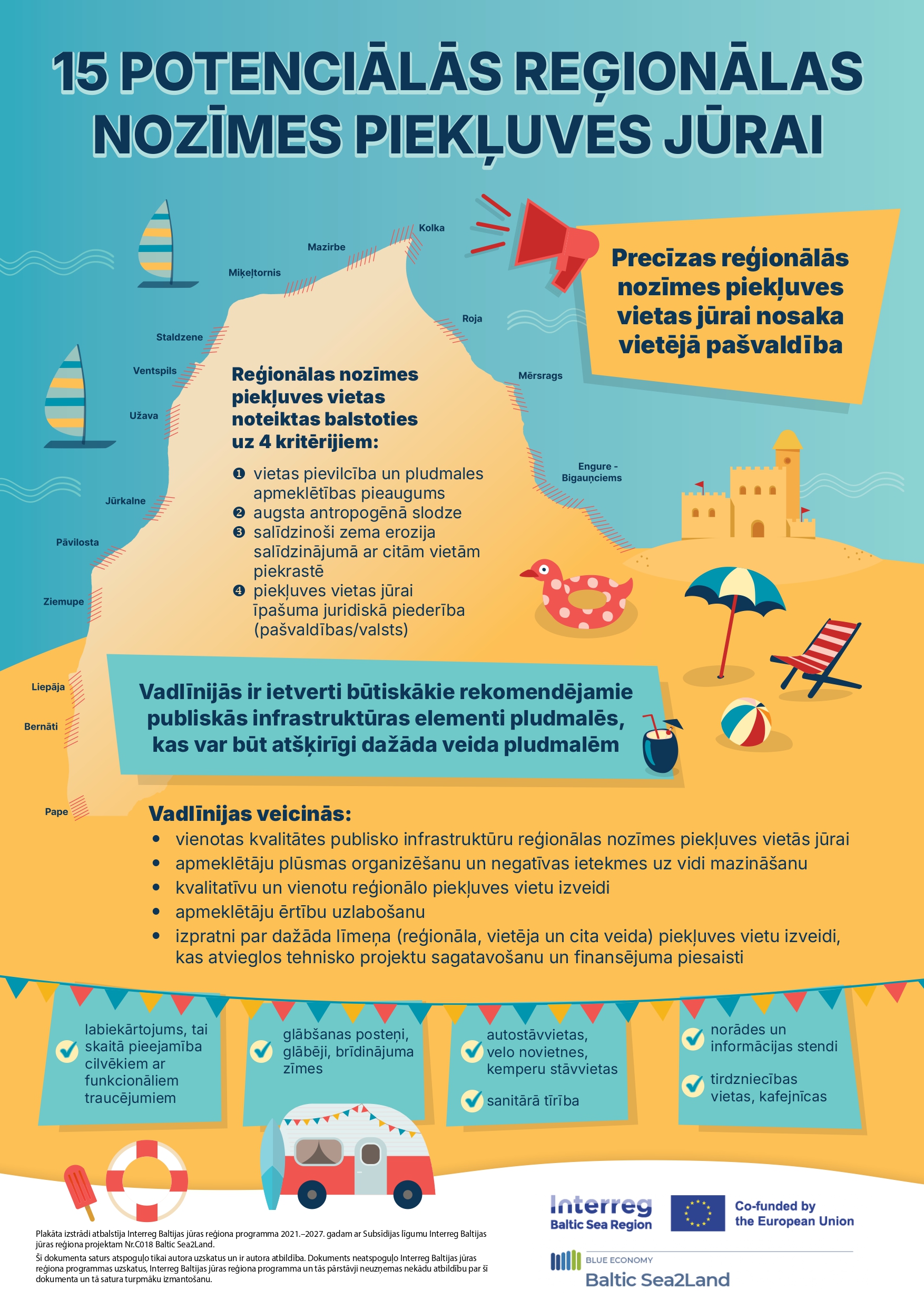 Otrs plakāts attēlo 15 potenciālās reģionālās nozīmes piekļuves jūrai, pamatojot šo vietu noteikšanas kritērijus, kā arī skaidro Vadlīnijas publisko piekļuves vietu jūrai infrastruktūras izveidei.