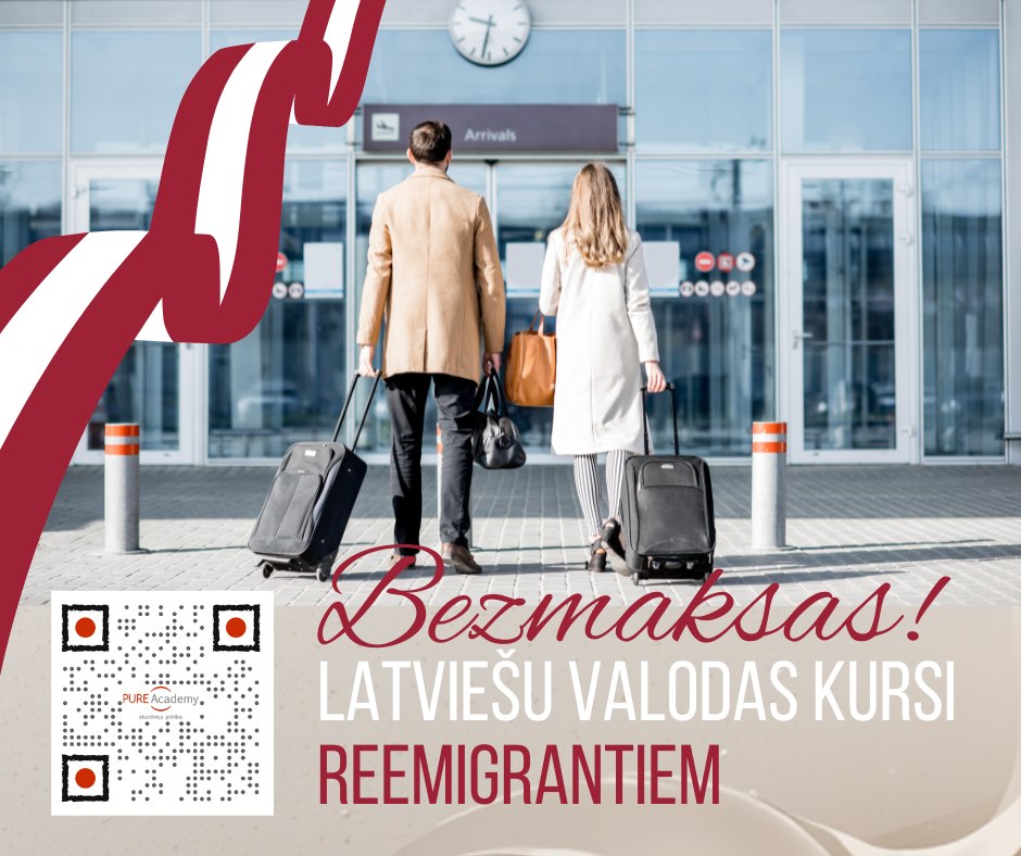 PURE Academy Latvija aicina remigrantus un viņu ģimenes locekļus pieteikties bezmaksas latviešu valodas kursiem. Nodarbības notiks tiešsaistē un būs piemērotas tiem, kuri vēlas uzlabot latviešu valodas prasmes un veiksmīgāk iekļauties latviskajā vidē Latvijā. Kursu norise Nodarbības tiešsaistē (ZOOM) 120 akadēmiskās stundas Nodarbību laikā angļu valoda tiks izmantota kā starpvaloda Kas ir remigrants? Remigrants ir persona,
