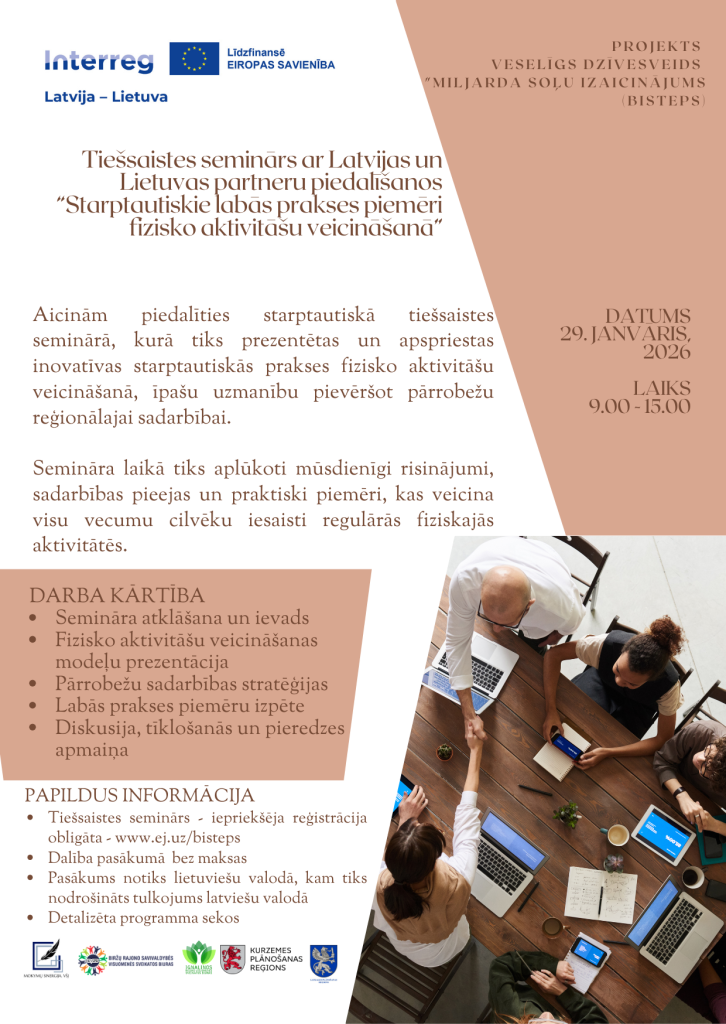 2026.gada 29. janvārī no plkst. 9.00 līdz 15.00 norisināsies starptautisks tiešsaistes seminārs “Starptautiskie labās prakses piemēri fizisko aktivitāšu veicināšanā”, kurā aicināti piedalīties interesenti no Latvijas un Lietuvas. Pasākuma mērķis ir dalīties ar starptautisku pieredzi un aktualizēt mūsdienīgas pieejas fizisko aktivitāšu veicināšanai, īpašu uzmanību pievēršot pārrobežu reģionālajai sadarbībai. Pasākums notiks tiešsaistē, un dalība tajā ir bez