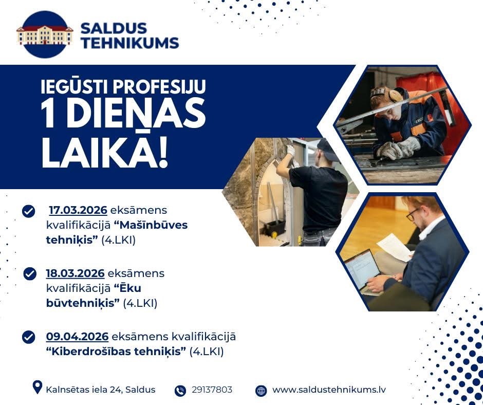 Plašāka informācija un pieteikšanās eksāmeniem: https://www.saldustehnikums.lv/izglitibas-iespejas/pieauguso-izglitiba/arpus-formala-izglitiba/