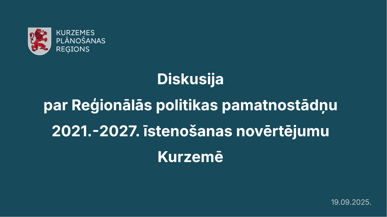 2025. gada 19.septembrī Kurzemes plānošanas reģions attālināti pulcēja reģiona pašvaldību pārstāvjus diskusijā ar Viedās administrācijas un reģionālās attīstības ministriju (VARAM). Diskusijas mērķis bija izvērtēt Reģionālās politikas pamatnostādņu 2021–2027. gadam (RPP2027) īstenošanu, apspriest līdzšinējo atbalstu un tā atbilstību reģiona vajadzībām, kā arī apkopot priekšlikumus nākotnes reģionālās politikas plānošanai pēc 2027. gada.