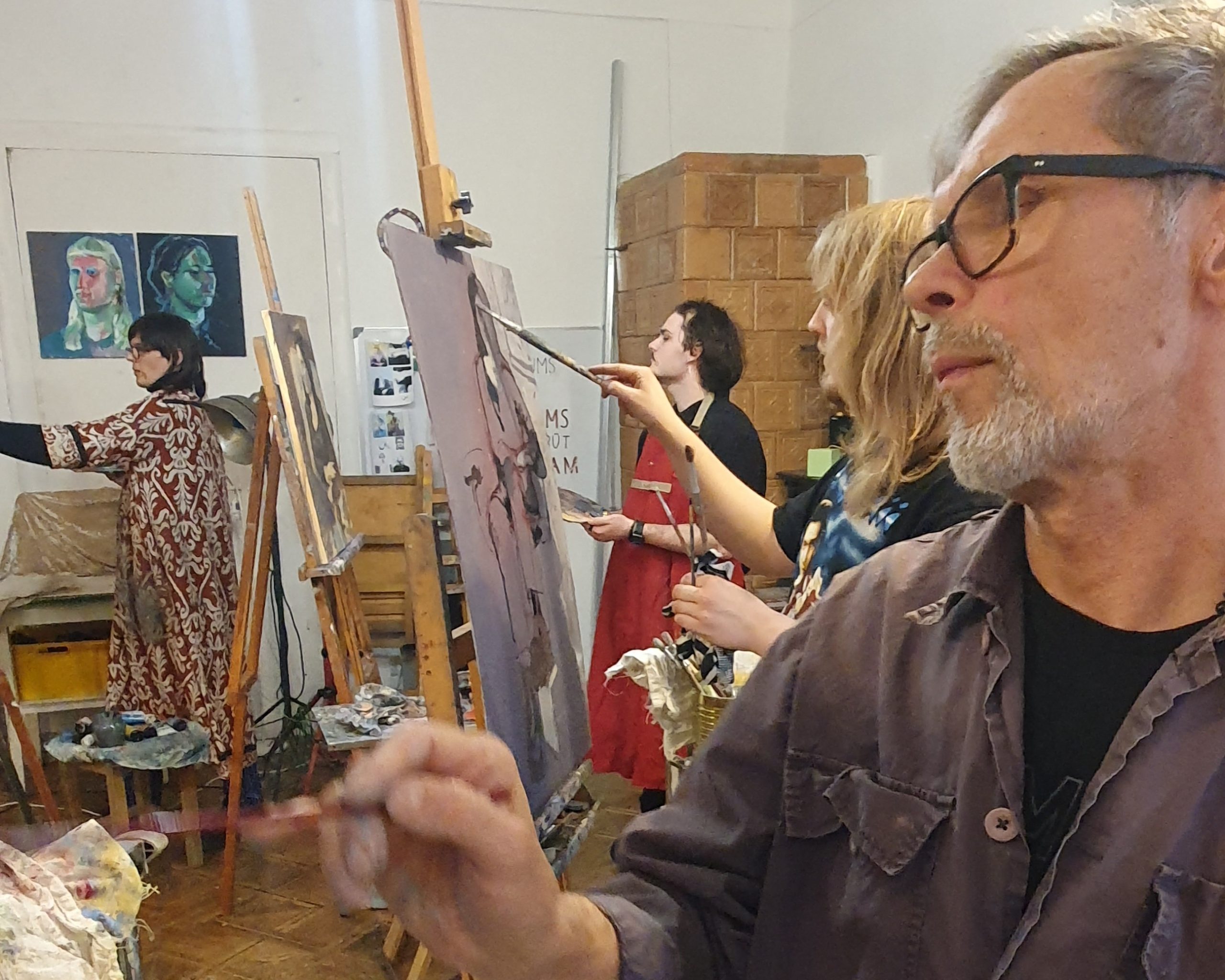 Attēlā: Darba process mākslinieka Ulda Rubeža studijā “Strūklaka”, kas darbojas vairāk nekā trīs gadus, paverot iespēju izkopt mākslinieciskās iemaņas glezniecībā.