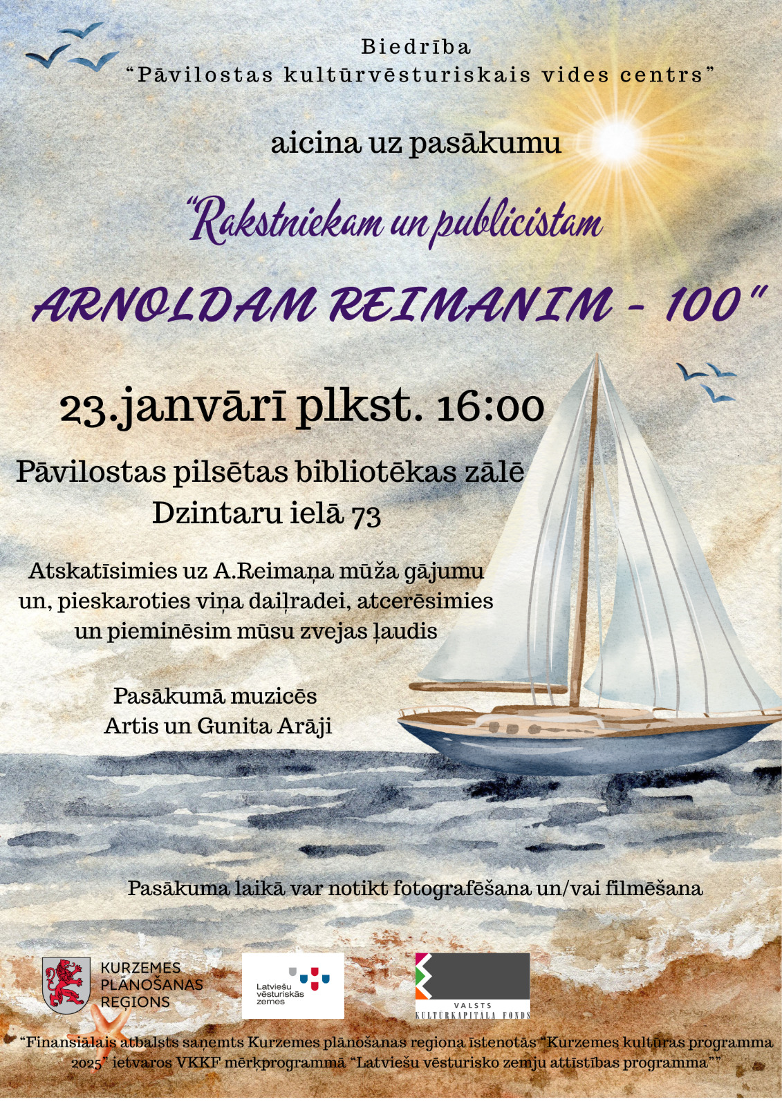 Biedrība “Pāvilostas kultūrvēsturiskais vides centrs” aicina uz pasākumu “Rakstniekam un publicistam Arnoldam Reimanim – 100”, kas notiks 23. janvārī plkst. 16.00 Pāvilostas pilsētas bibliotēkas zālē (Dzintaru ielā 73).
