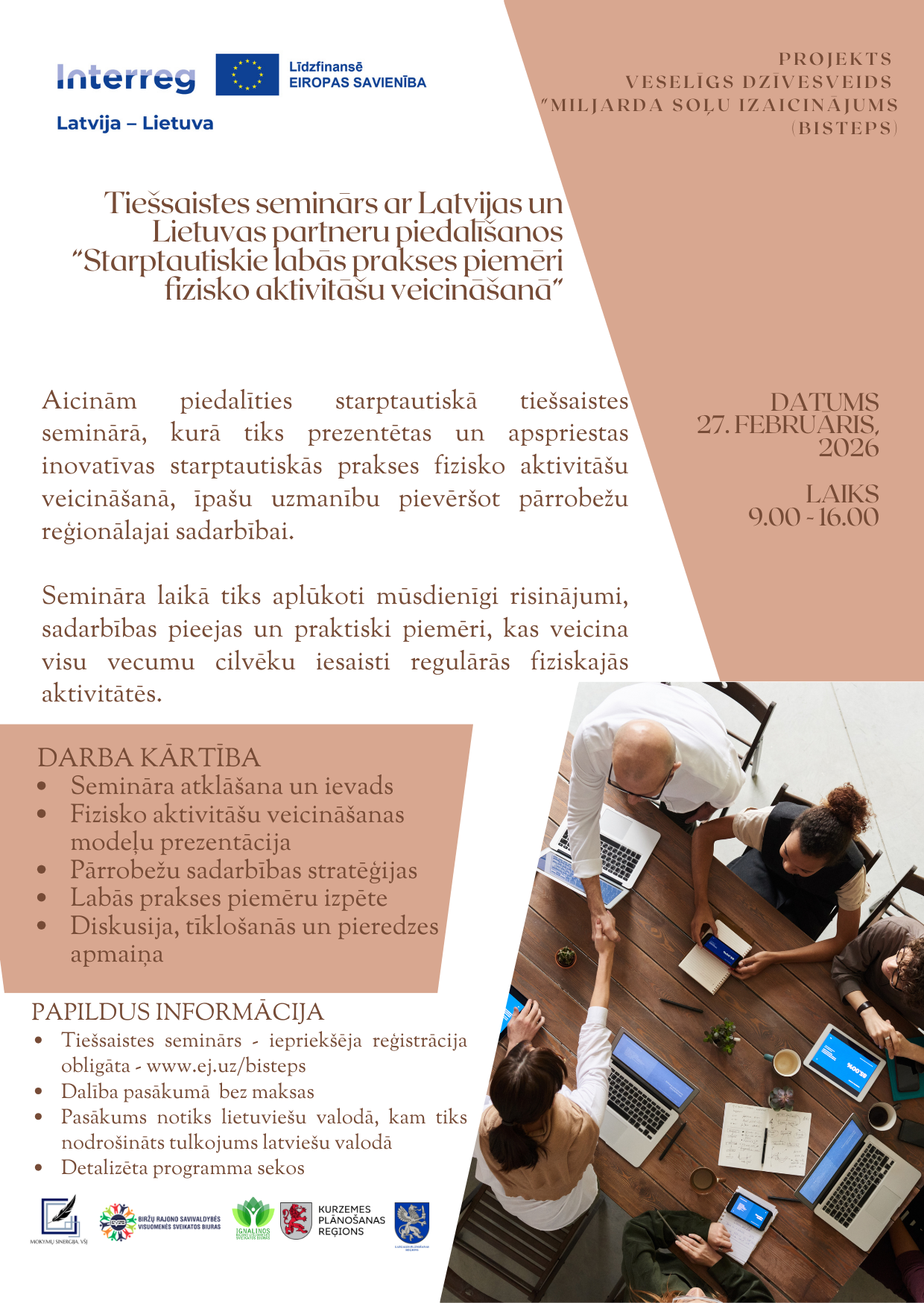 Tiešsaistes seminārs tiek organizēts projekta “Veselīgs dzīvesveids – Miljarda soļu izaicinājums” (BISTEPS) ietvaros ar Interreg VI-A Latvijas–Lietuvas programma 2021–2027 finansiālu atbalstu.