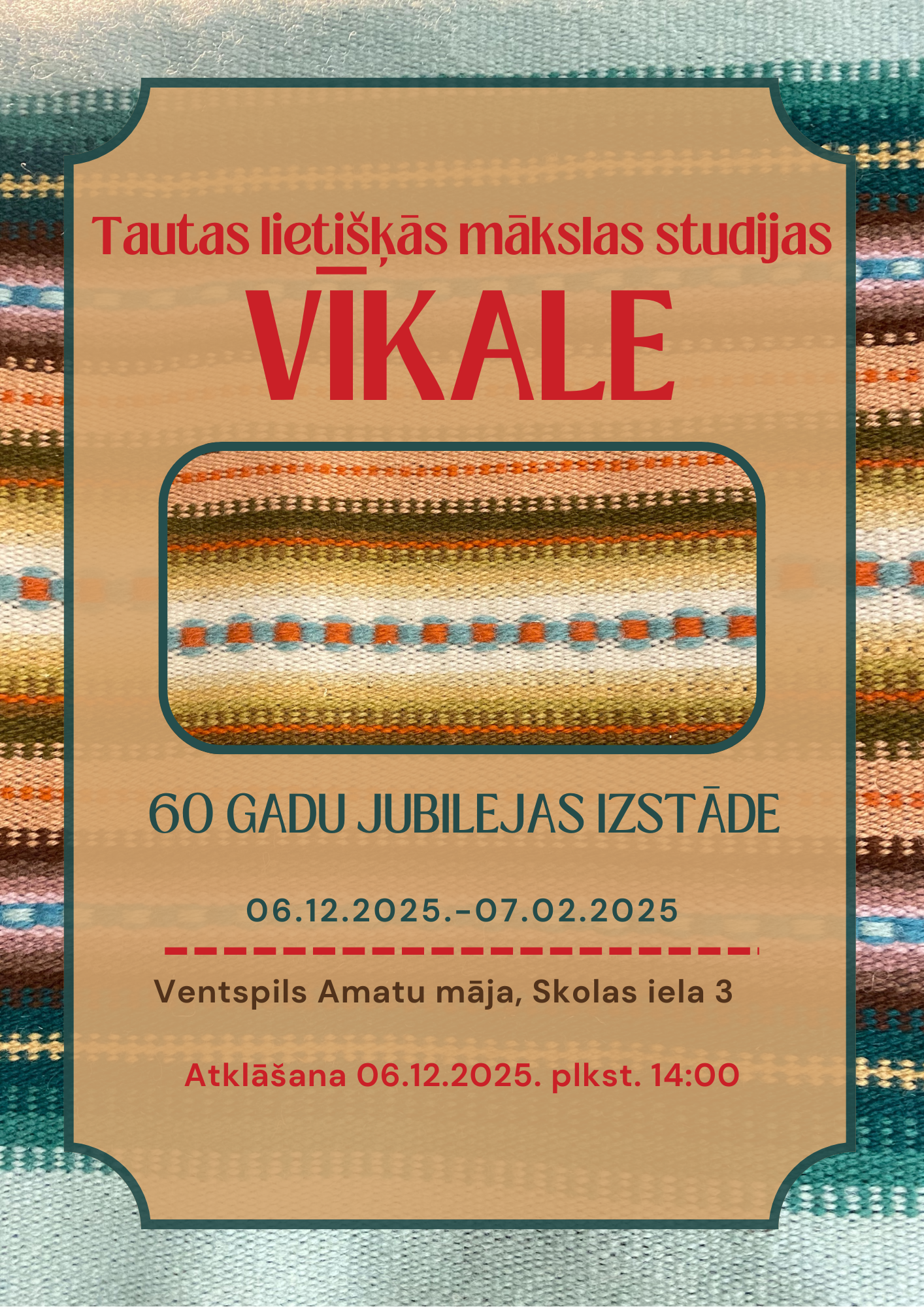 6.decembrī plkst. 14.00 Amatu mājā (Skolas ielā 3) notiks Tautas lietišķās mākslas studijas “Vīkale” 60 gadu jubilejas izstādes atklāšana. Jubilejas izstādē būs aplūkojami darbi, kas tapuši pēdējo desmit gadu laikā. Studija savu darbību sāka 1965. gadā kā pulciņš Mildas Silmanes vadībā.