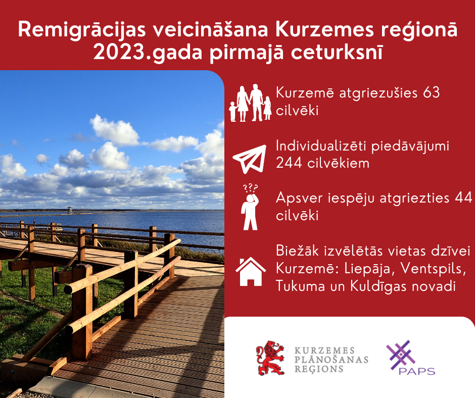 2023.gada 1.ceturksnī Kurzemes reģionā atgriezušies 63 cilvēki, bet vēlmi atgriezties pauduši 44 cilvēki. Savukārt kopumā piecu gadu laikā – no projekta sākuma 2018. gada martā līdz šī martam – Kurzemes reģionā atgriezušies 1037 cilvēki, bet interesi par atgriešanos Kurzemē izrādījuši 762 cilvēki. Biežāk izvēlētās vietas dzīvei Kurzemē ir Liepāja un Ventspils, kā arī Tukuma, Kuldīgas un Talsu novadi.