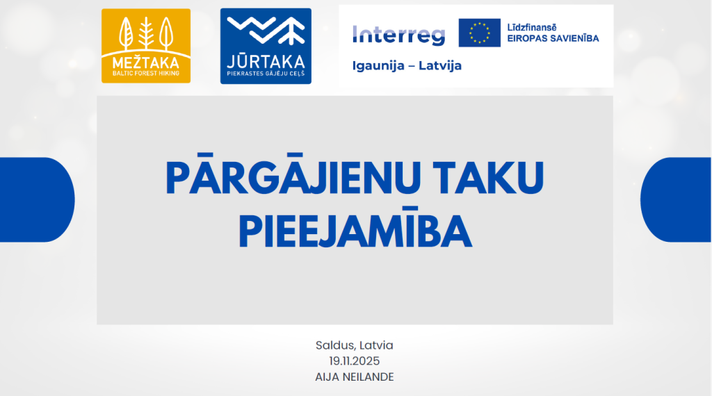 Semināra sākumā dalībnieki tika iepazīstināti ar pieejamības uzlabojumiem garo distanču pārgājienu maršrutos Jūrtaka un Mežtaka, kas tiek īstenoti ar Interreg Igaunijas–Latvijas programmas atbalstu projektā “Pārgājienu taku pieejamība”. Tika stāstīts par ieviestajiem risinājumiem – peldošajiem ratiņkrēsliem, Apšuciema un Klapkalnciema pludmales labiekārtojumu, audio gidiem –, kā arī par plānotajiem darbiem taku pieejamības uzlabošanā.