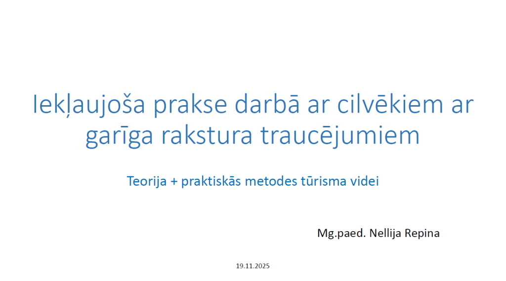 2025. gada 19. novembrī Laipa SPA & Restorāns Saldū pulcējās tūrisma nozares pārstāvji – gidi, naktsmītņu un ēdināšanas pakalpojumu sniedzēji, kā arī tūrisma speciālisti –, lai piedalītos seminārā “Kā uzņemt viesus ar redzes vai garīgā rakstura traucējumiem”. Semināra mērķis bija stiprināt zināšanas darbā ar cilvēkiem ar funkcionāliem traucējumiem un veicināt iekļaujošākas un pieejamākas tūrisma vides attīstību Latvijā.