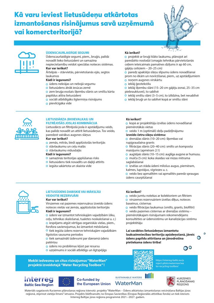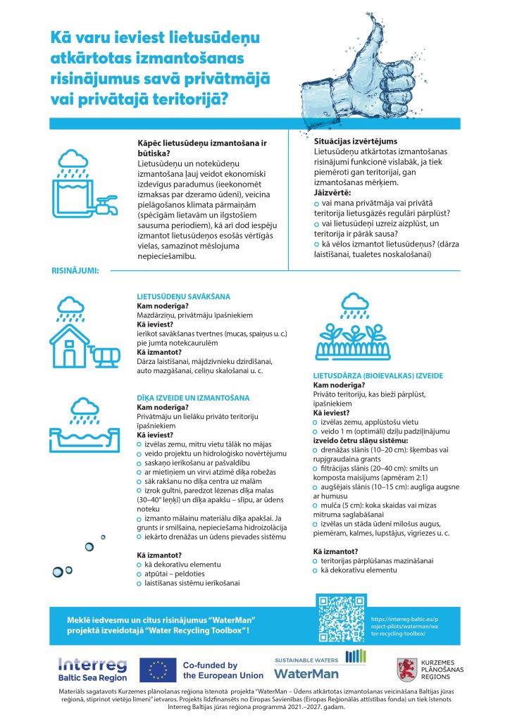 Publikācija sagatavota Kurzemes plānošanas reģiona īstenotā projekta “WaterMan – Ūdens atkārtotas izmantošanas veicināšana Baltijas jūras reģionā, stiprinot vietējo līmeni” ietvaros. Projekts līdzfinansēts no Eiropas Savienības (Eiropas Reģionālās attīstības fonda) un tiek īstenots Interreg Baltijas jūras reģiona programmā 2021.–2027. gadam.